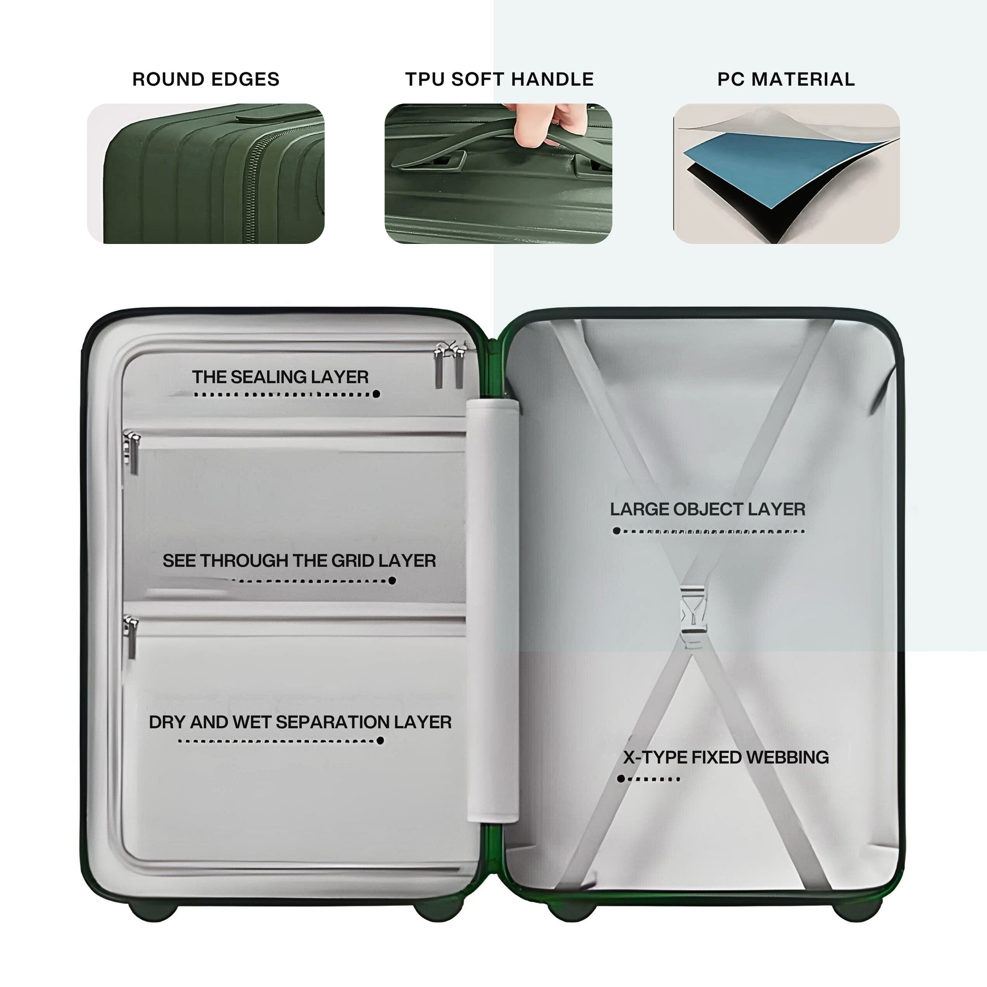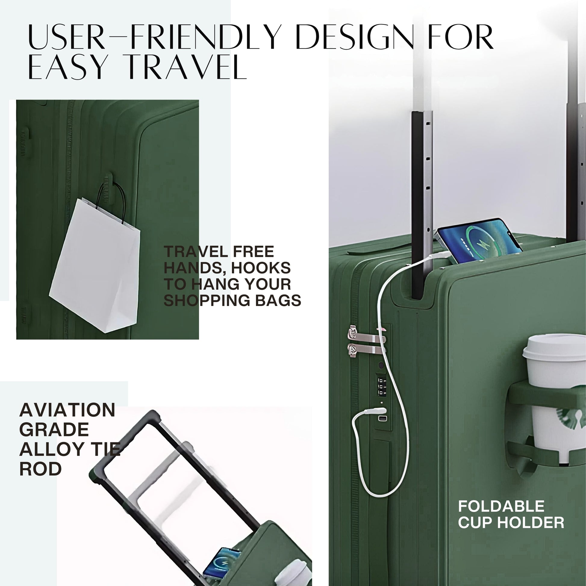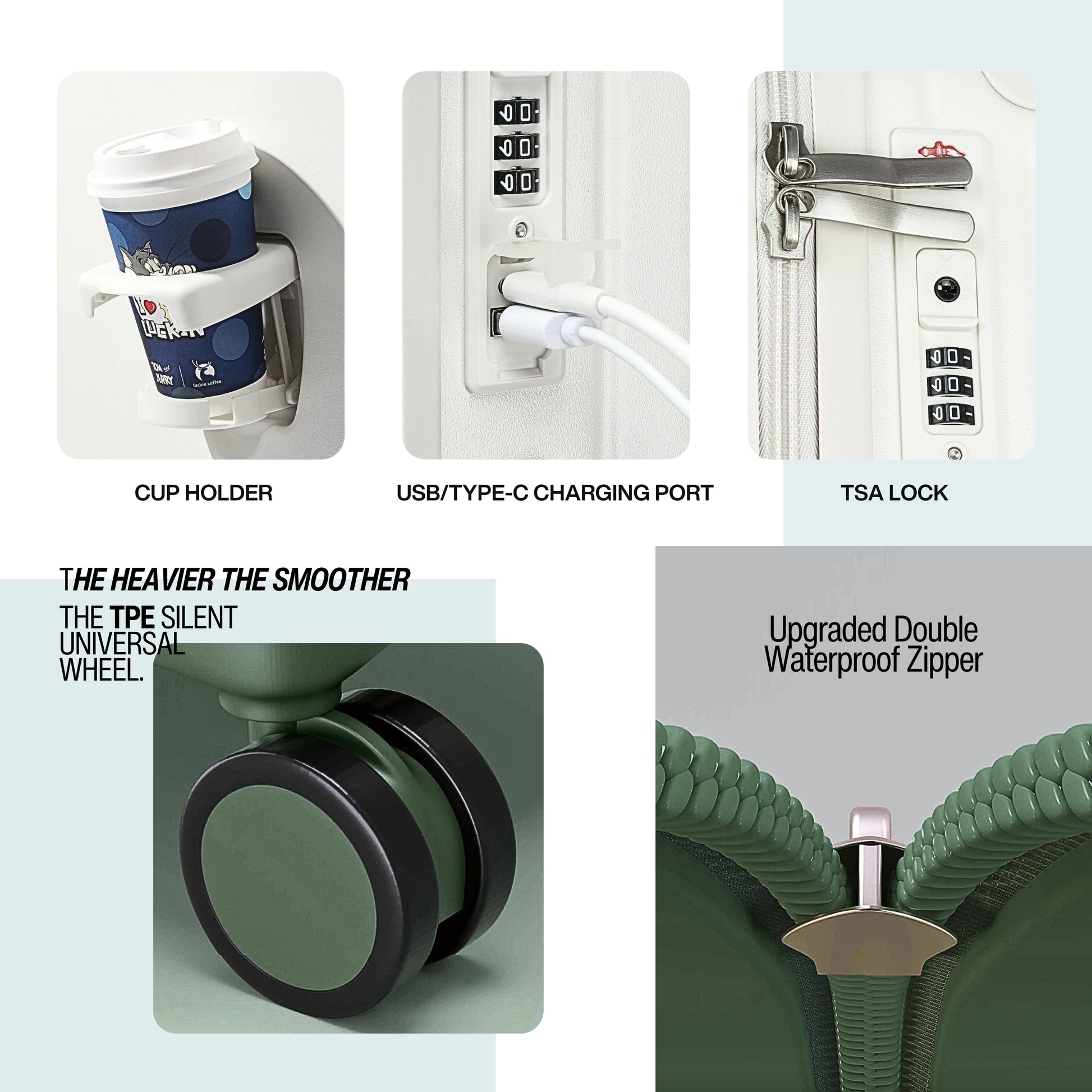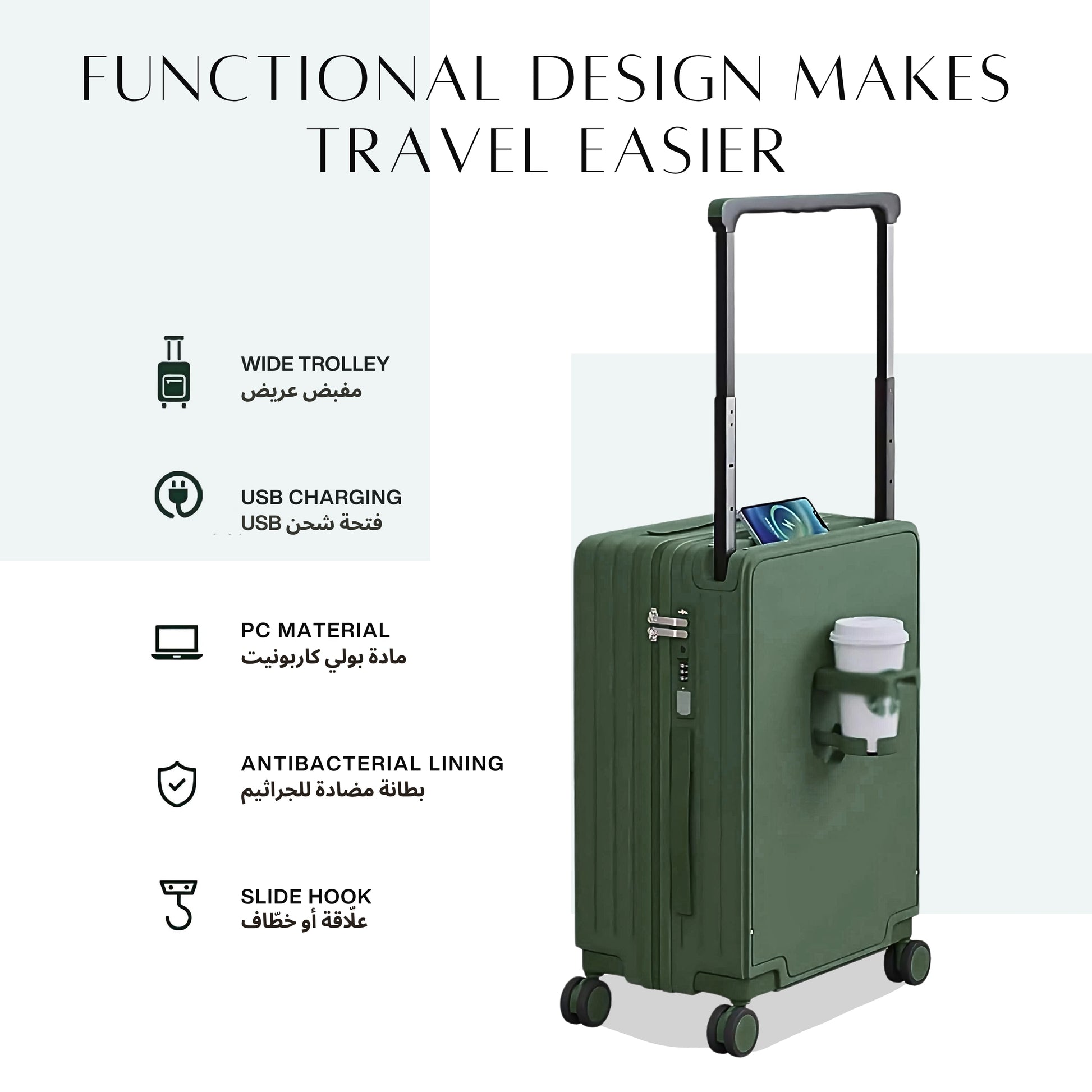 أفضل جودة: مصنوعة من مادة البولي كربونات عالية الجودة + ABS، خفيفة الوزن لكنها فائقة المتانة، مما يقلل من احتمالية التشقق والضغط العالي. ● سحاب مقاوم للانفجار وقفل TSA على الحقيبة يمنعان الانفجار ويضمنان الأمان أثناء السفر. يمكنك تعيين كلمة مرور مخصصة من 3 أرقام لمزيد من الخصوصية. ● مقبض سحب تلسكوبي من سبيكة معدنية مع زر ارتداد تلقائي يفتح بنقرة واحدة. حمل أمتعتك بكل سهولة. ● بطانة داخلية فاخرة - نسيج مضاد للبكتيريا للحفاظ على النظافة والراحة ومنع الروائح. ● عجلات دوارة مزدوجة سلسة وعالية الأداء، صامتة، ماصة للصدمات، وتدوم طويلًا. ● منفذان USB/Type-C لشحن أجهزتك بسهولة (لا يشمل المنتج بنك طاقة - يتم توصيله مباشرة من خلال الحقيبة).