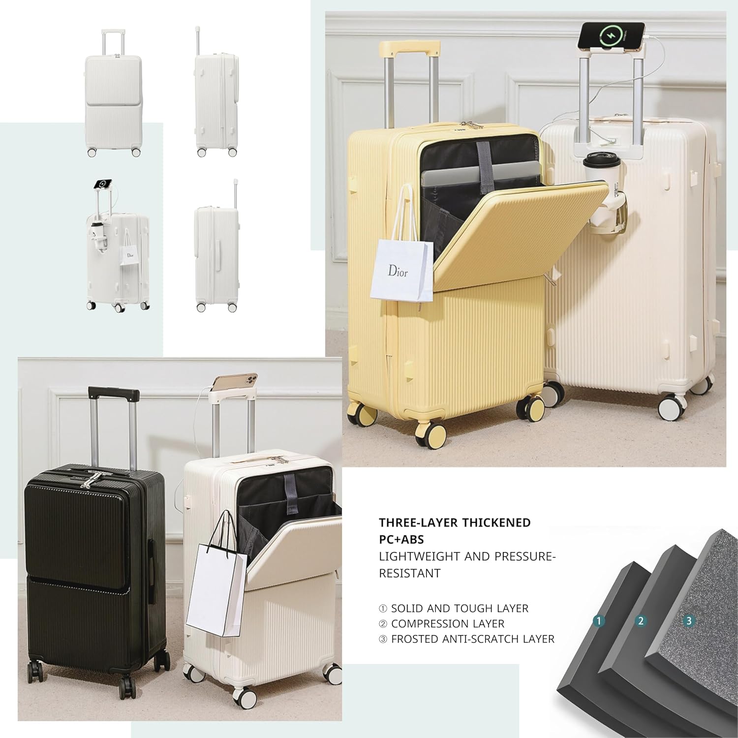 TEREPLUS® 20 Inch Travel Trolley Bag Suitcase with Front Open Laptop Compartment, USB Port Charging, Silent Wheels, Hook - Black & Mocha